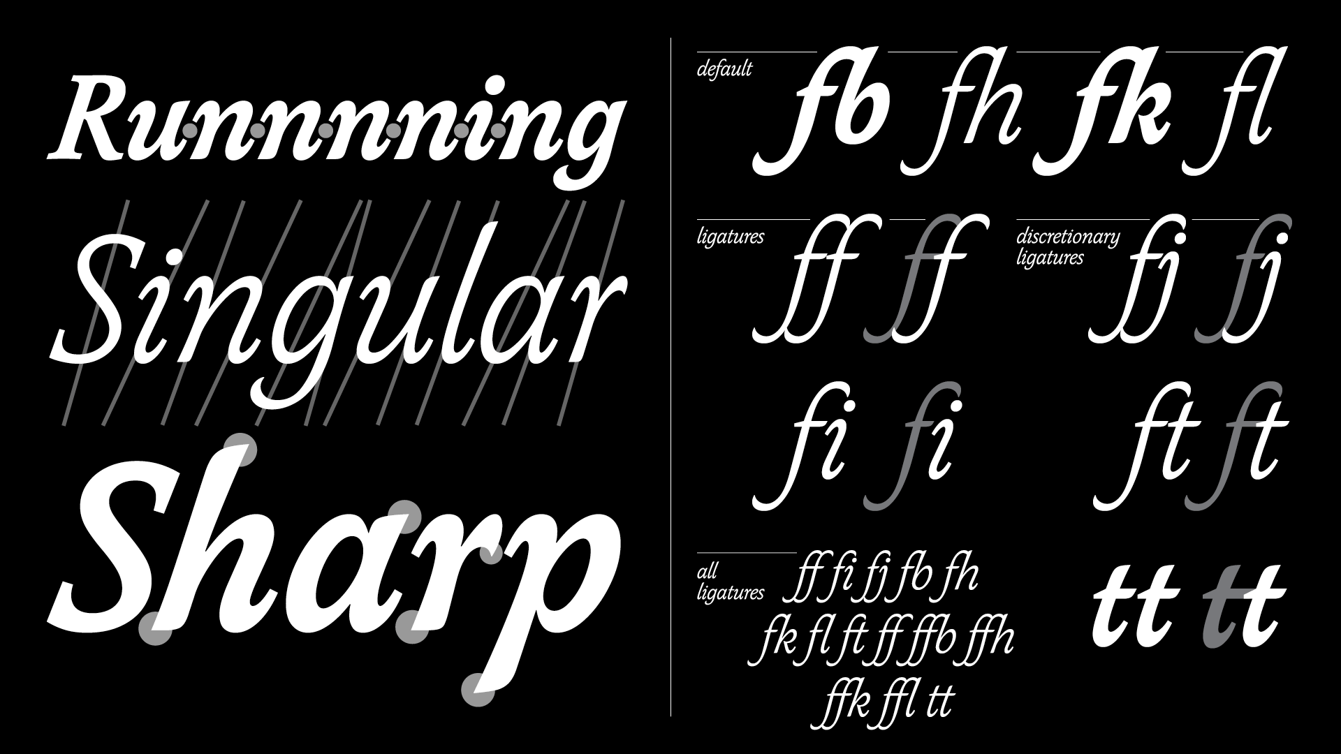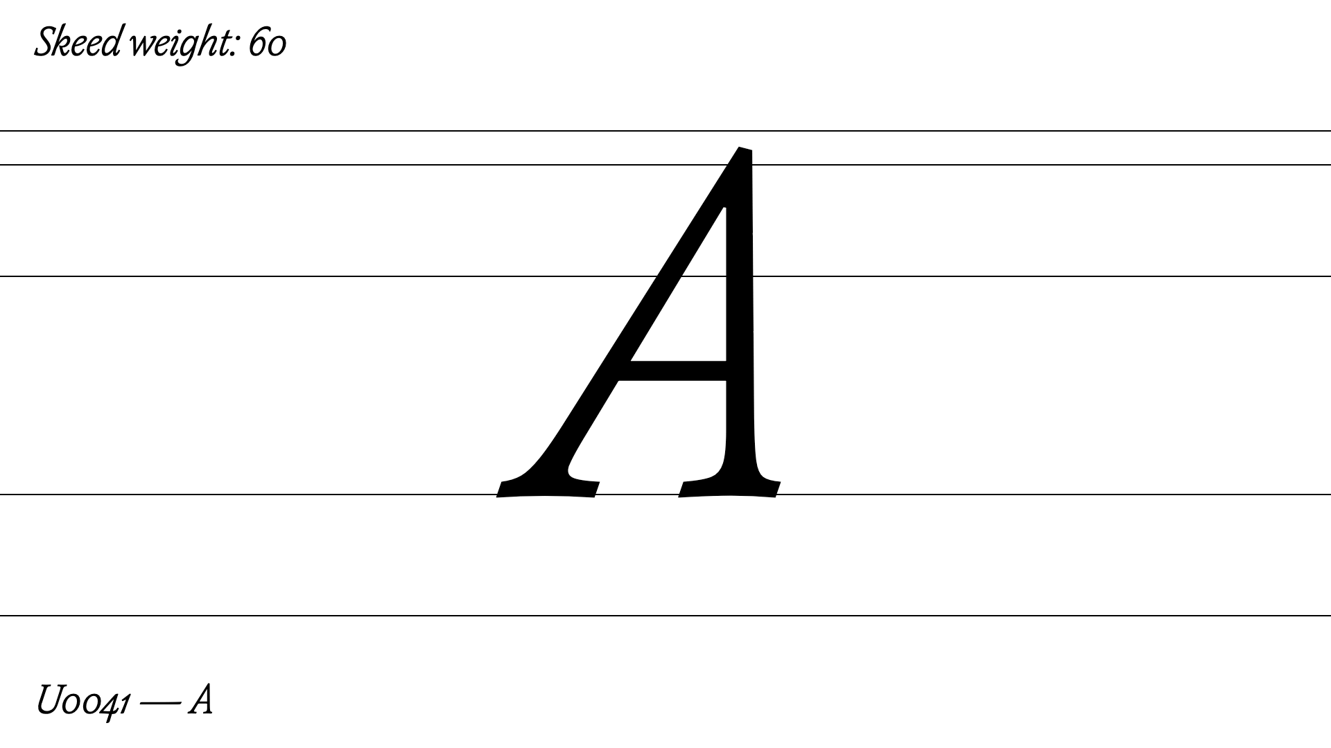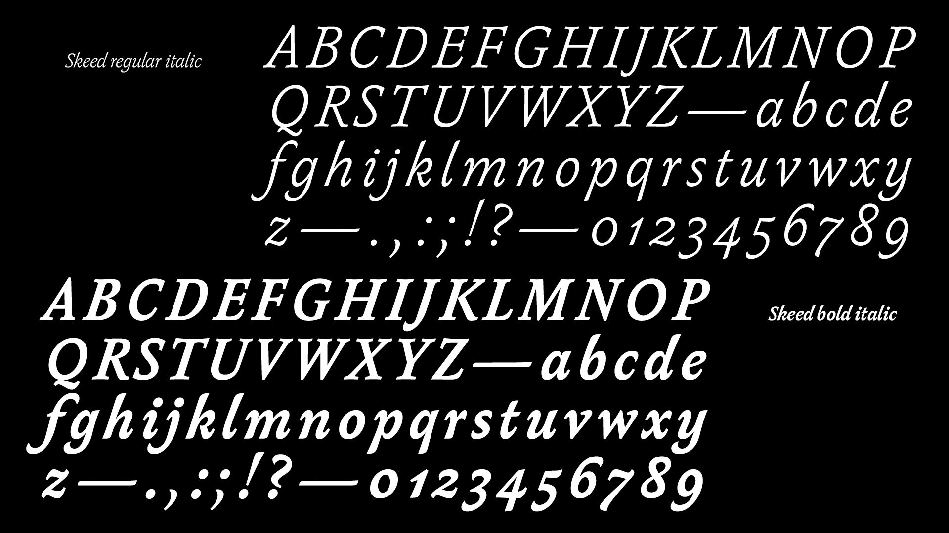 Skeed consists of an italic with interpolating variations in weight, a set of ligatures and a selection of swashed alternatives for the capitals.