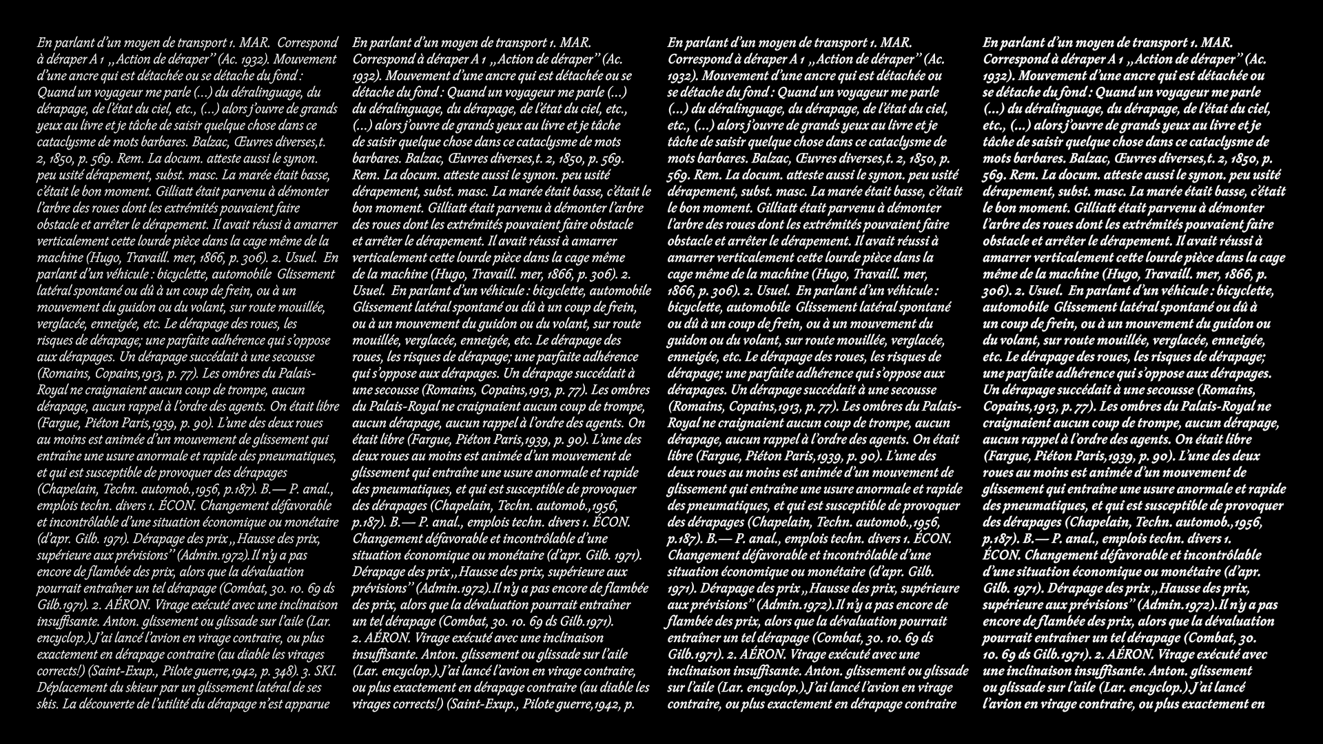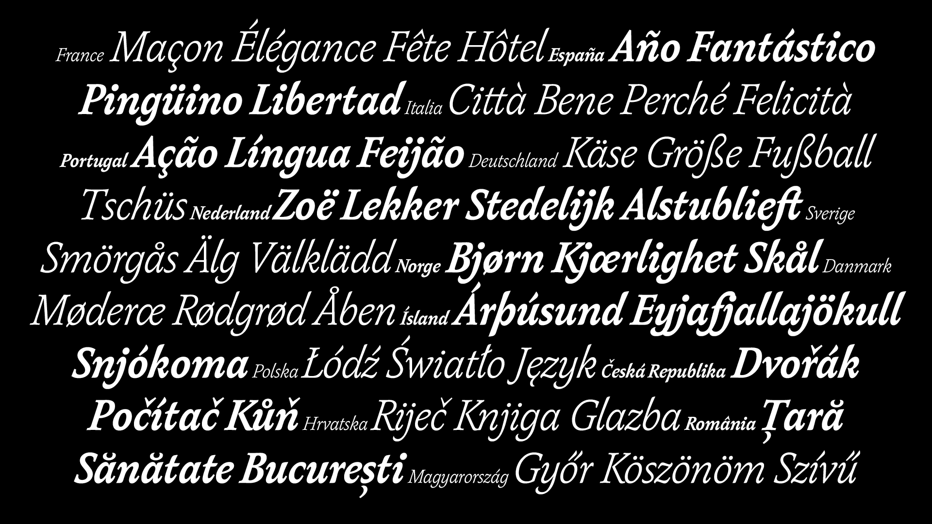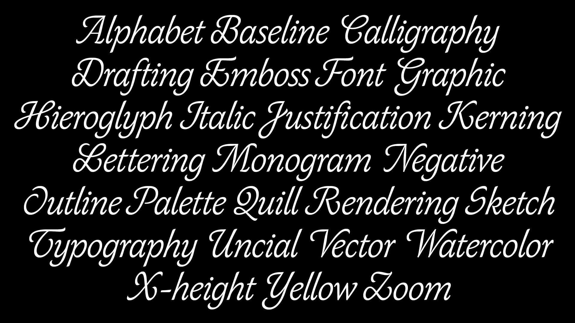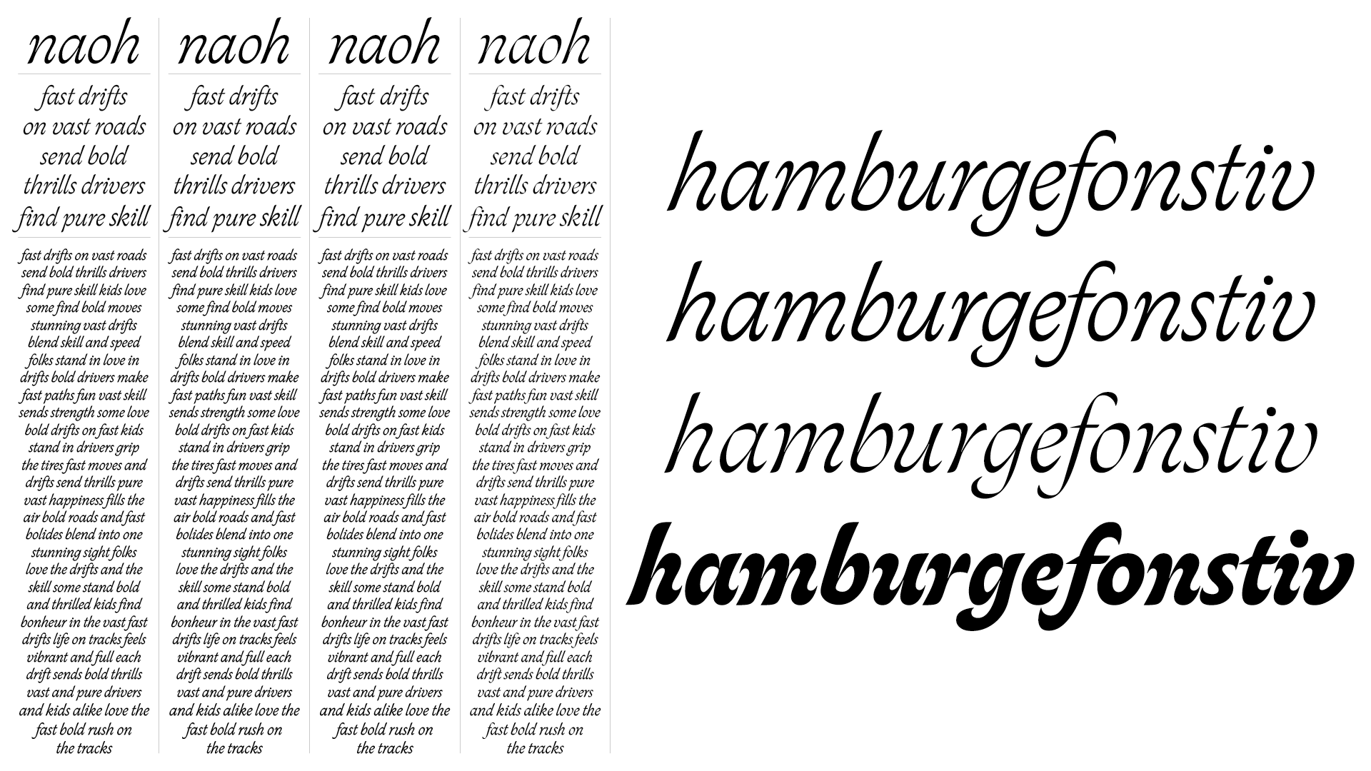 Skeed consists of an italic with interpolating variations in weight, a set of ligatures and a selection of swashed alternatives for the capitals.