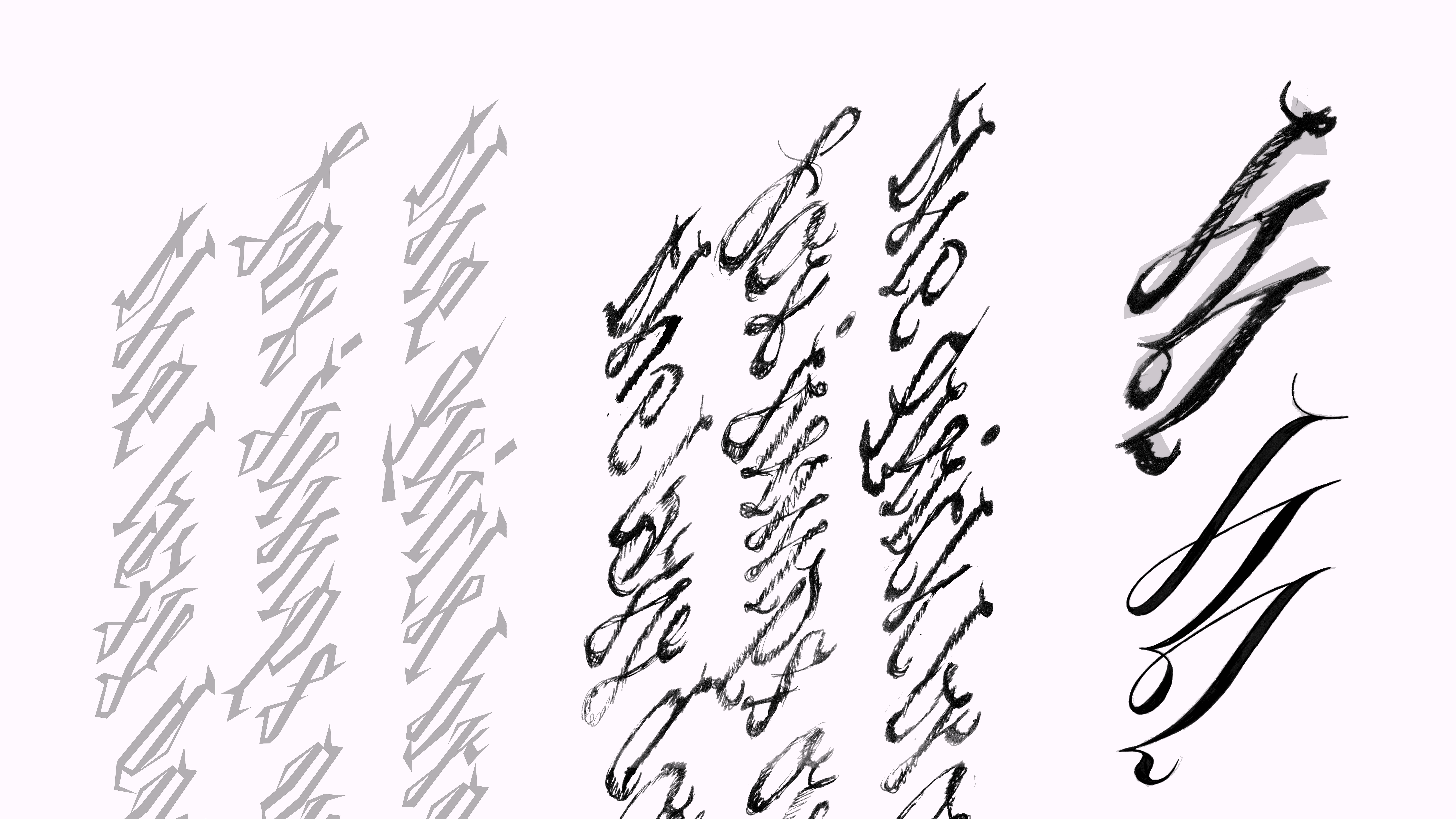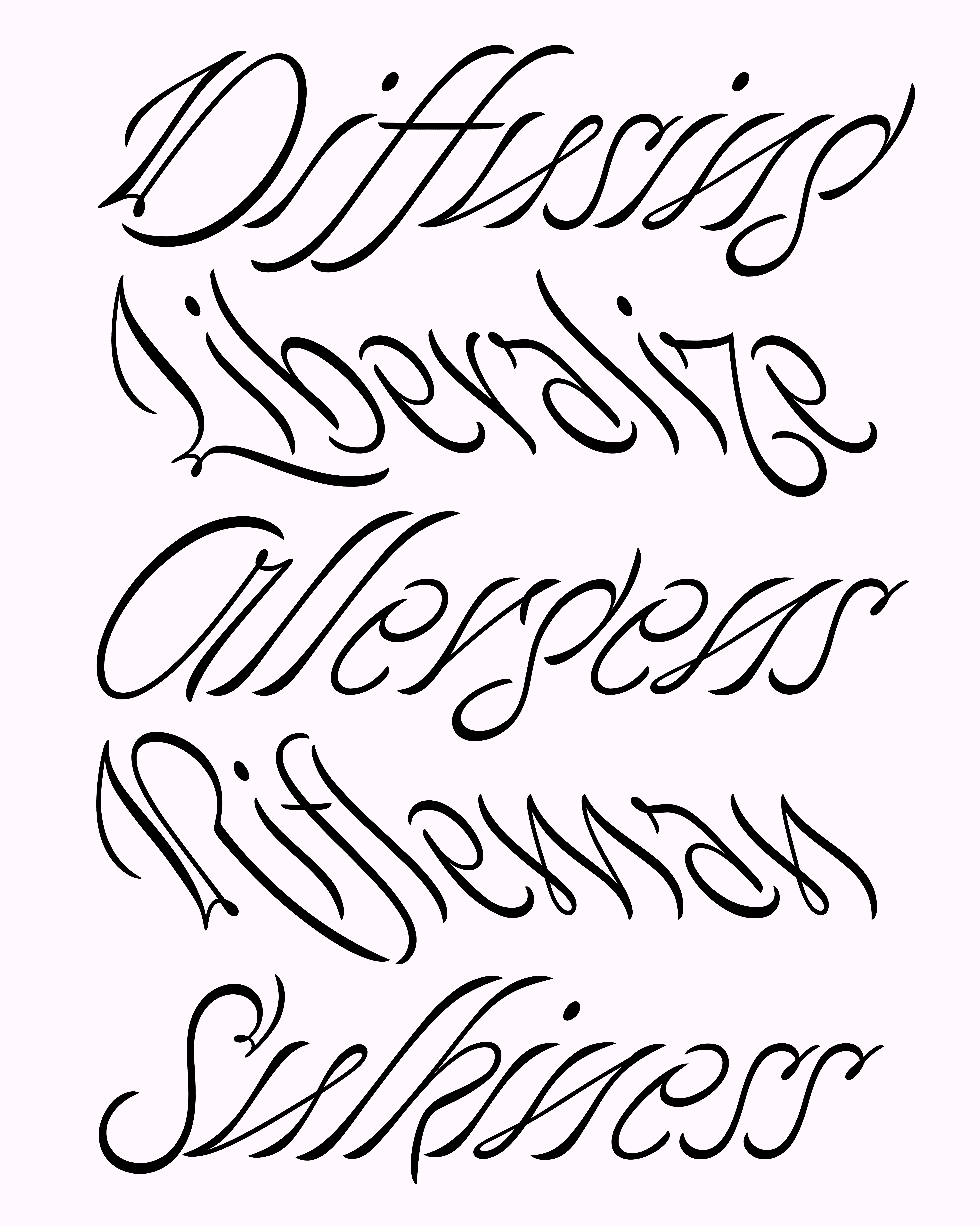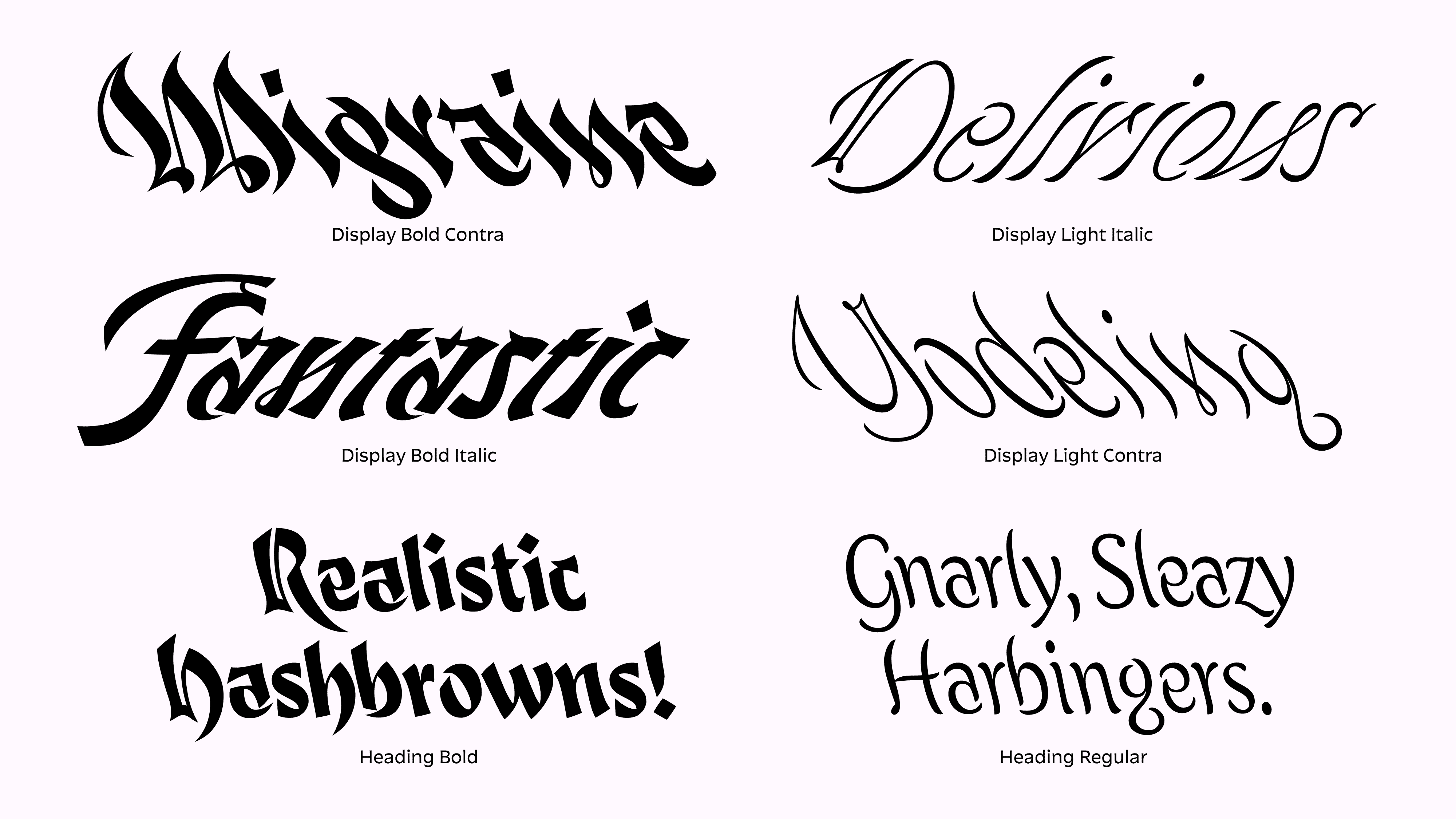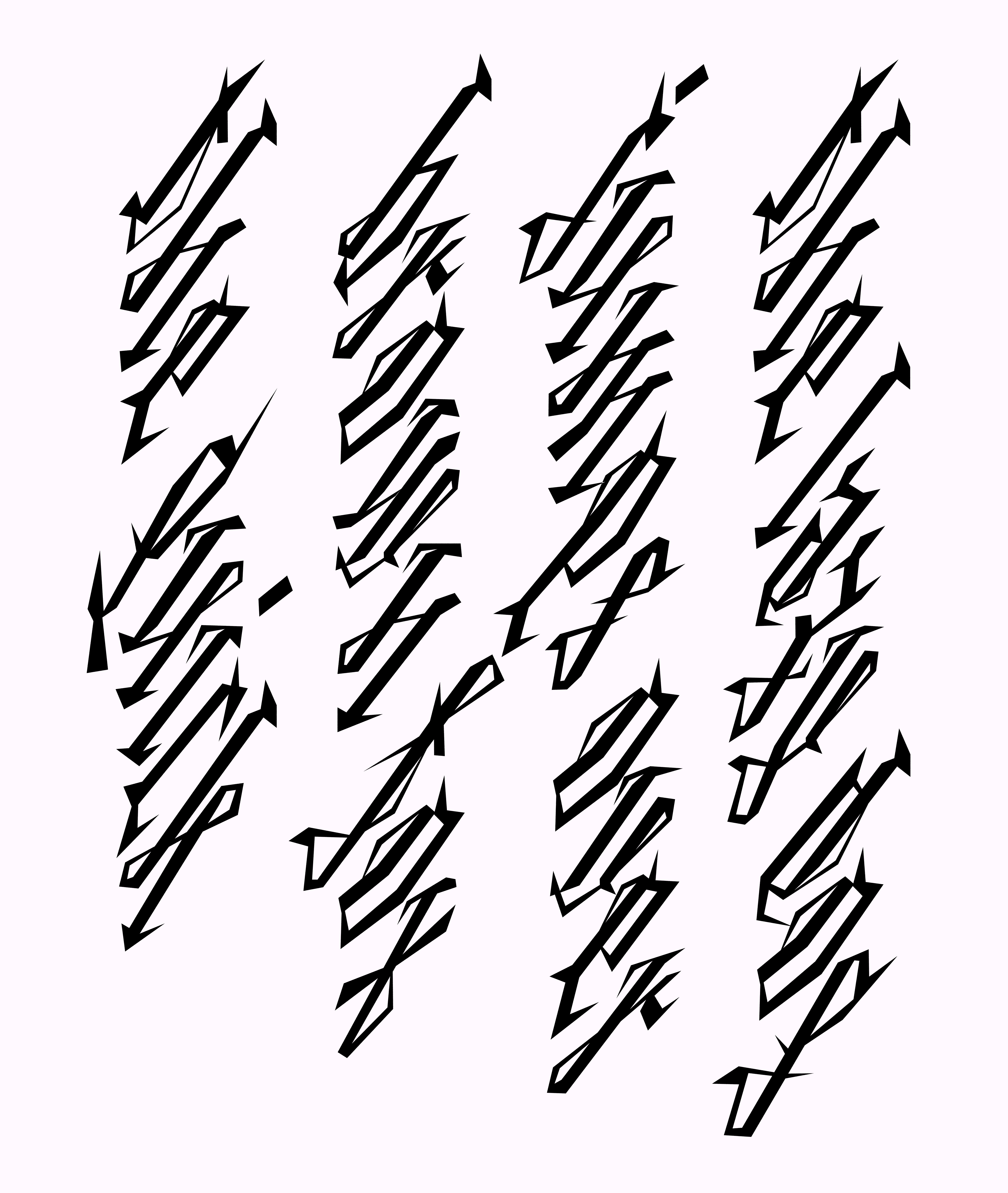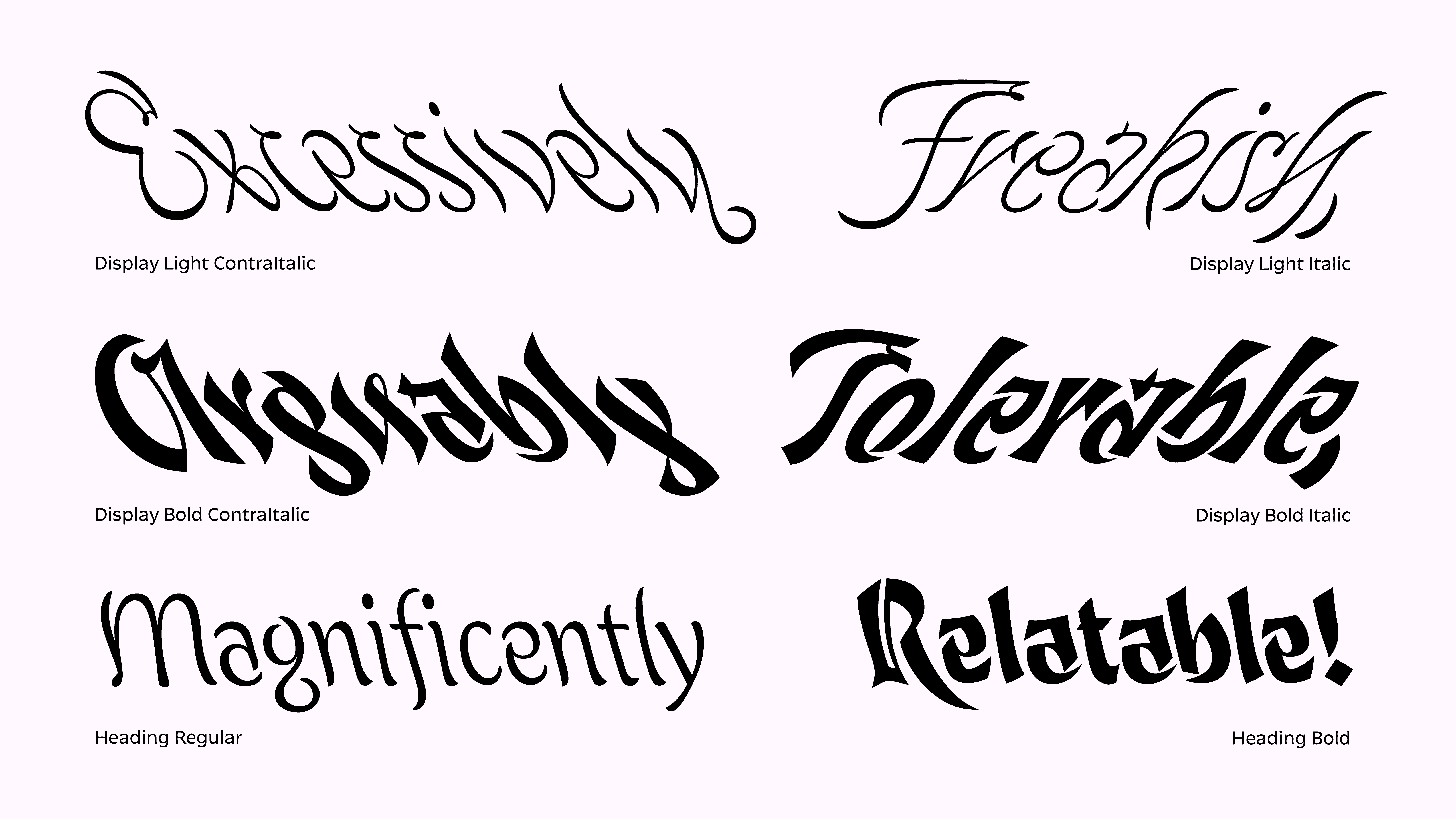 Antiphony is an exercise in extremity, excess, and developing continuity through opposing styles. I create oppositions through multiple vectors: contrast, italic slant, and tool influence. The process involved a lot of trial and error; finding the most extreme versions I could make, then molding them into a cohesive system.