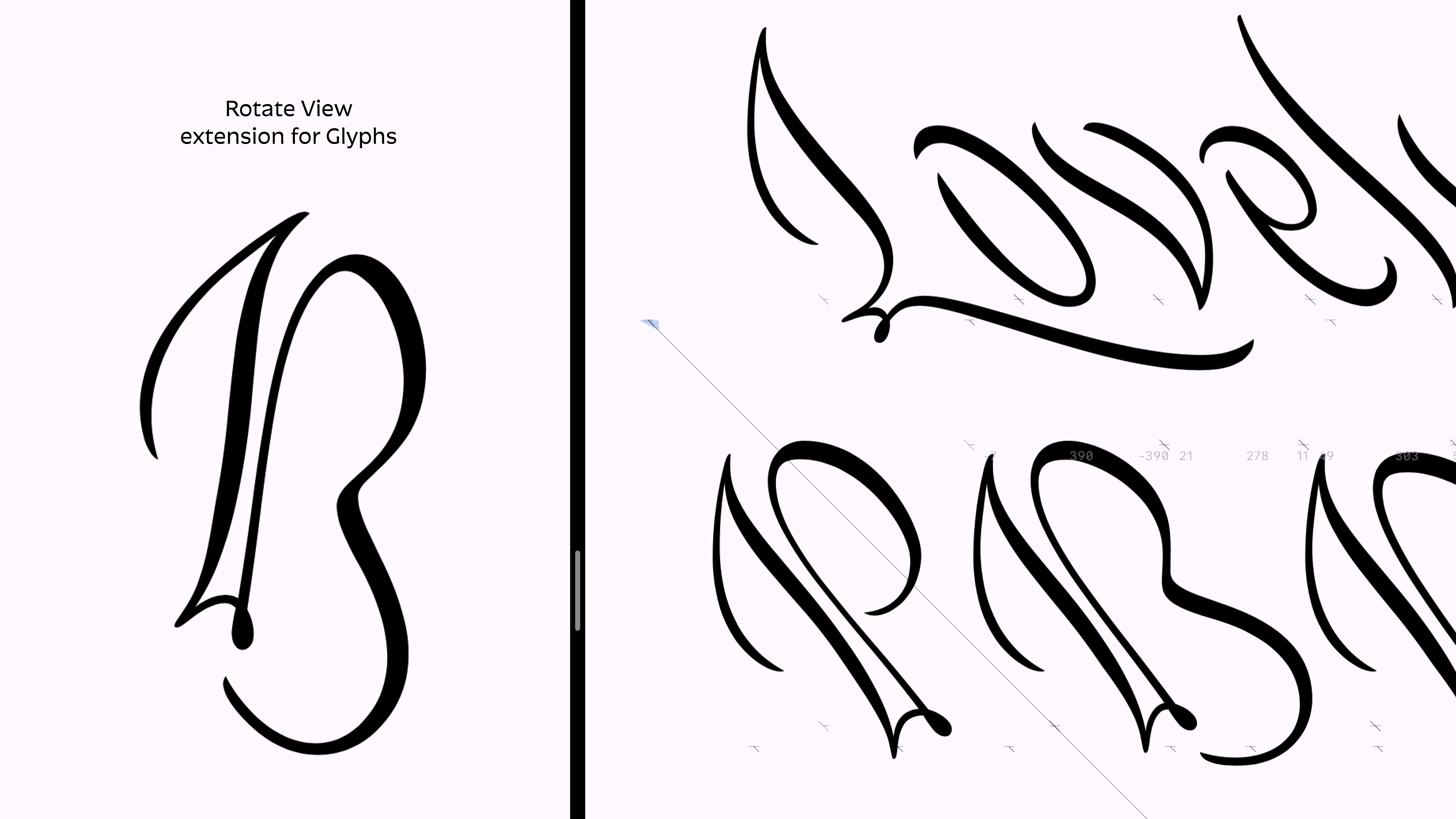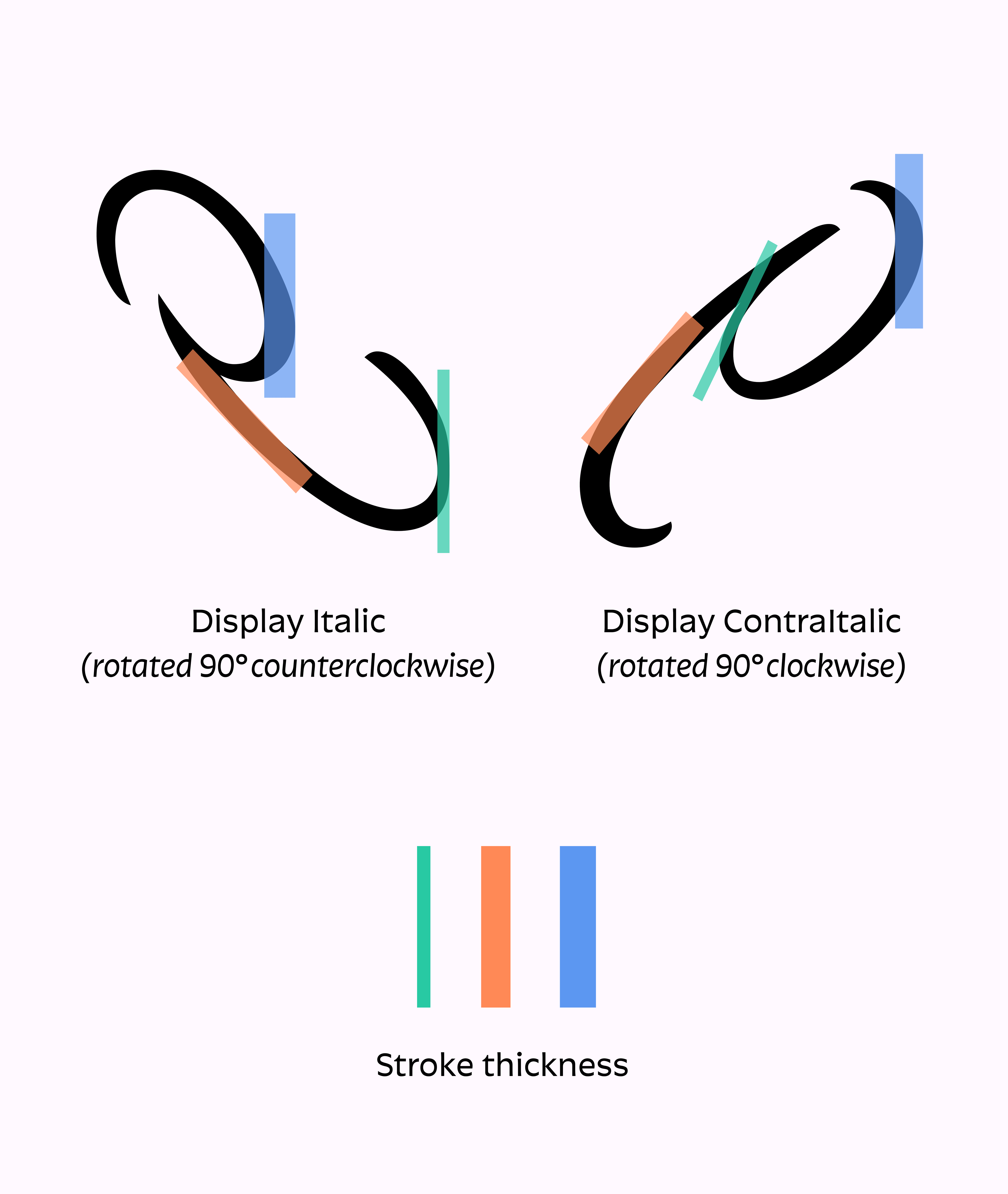 Due to the extreme angle of the forward and reverse italics, Antiphony is suitable for setting type at 45° in either direction. Additionally, the fluid nature of the design allows the type to be set naturally on curved paths.