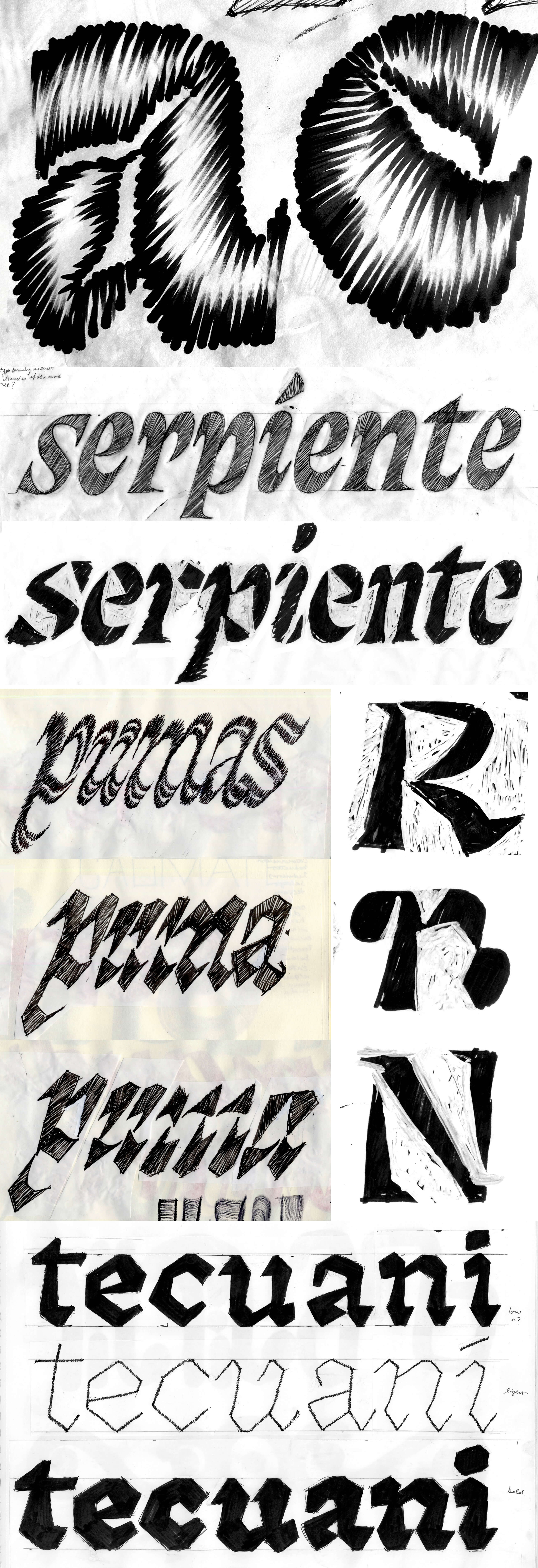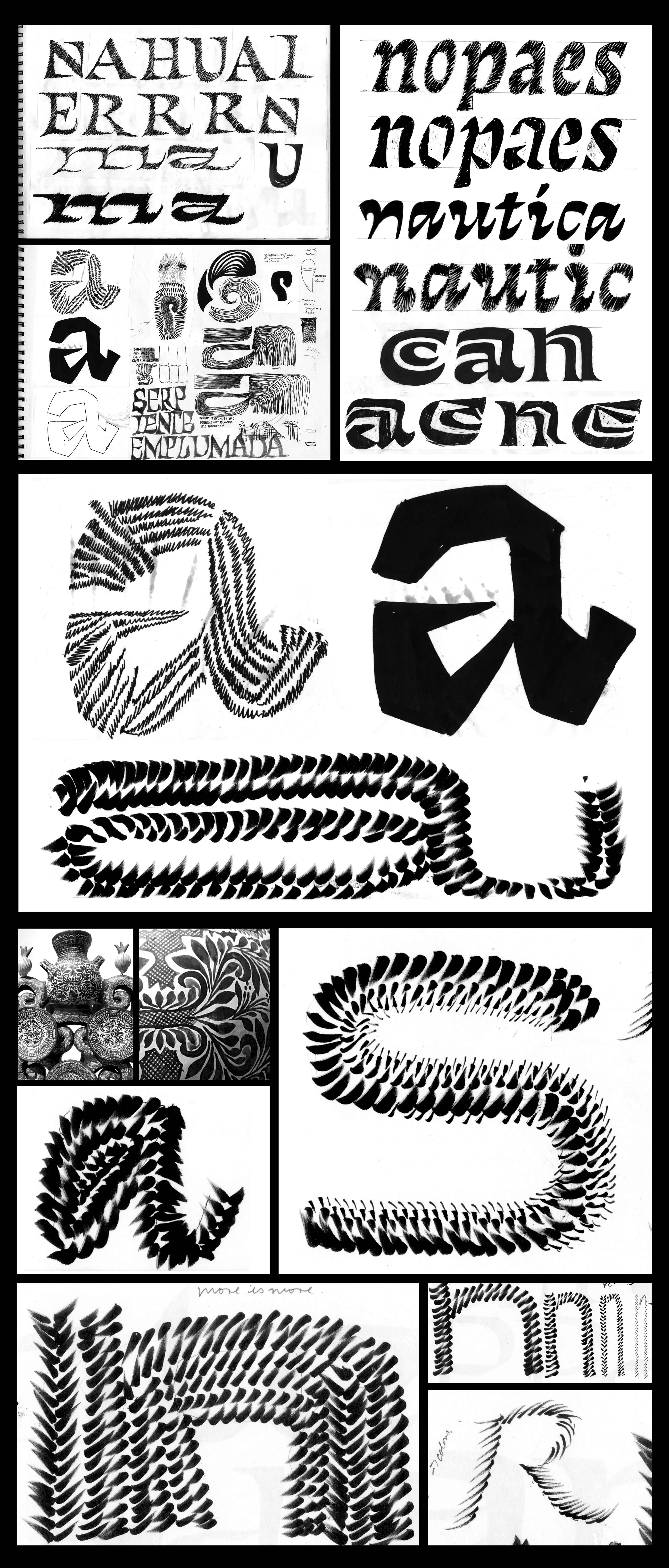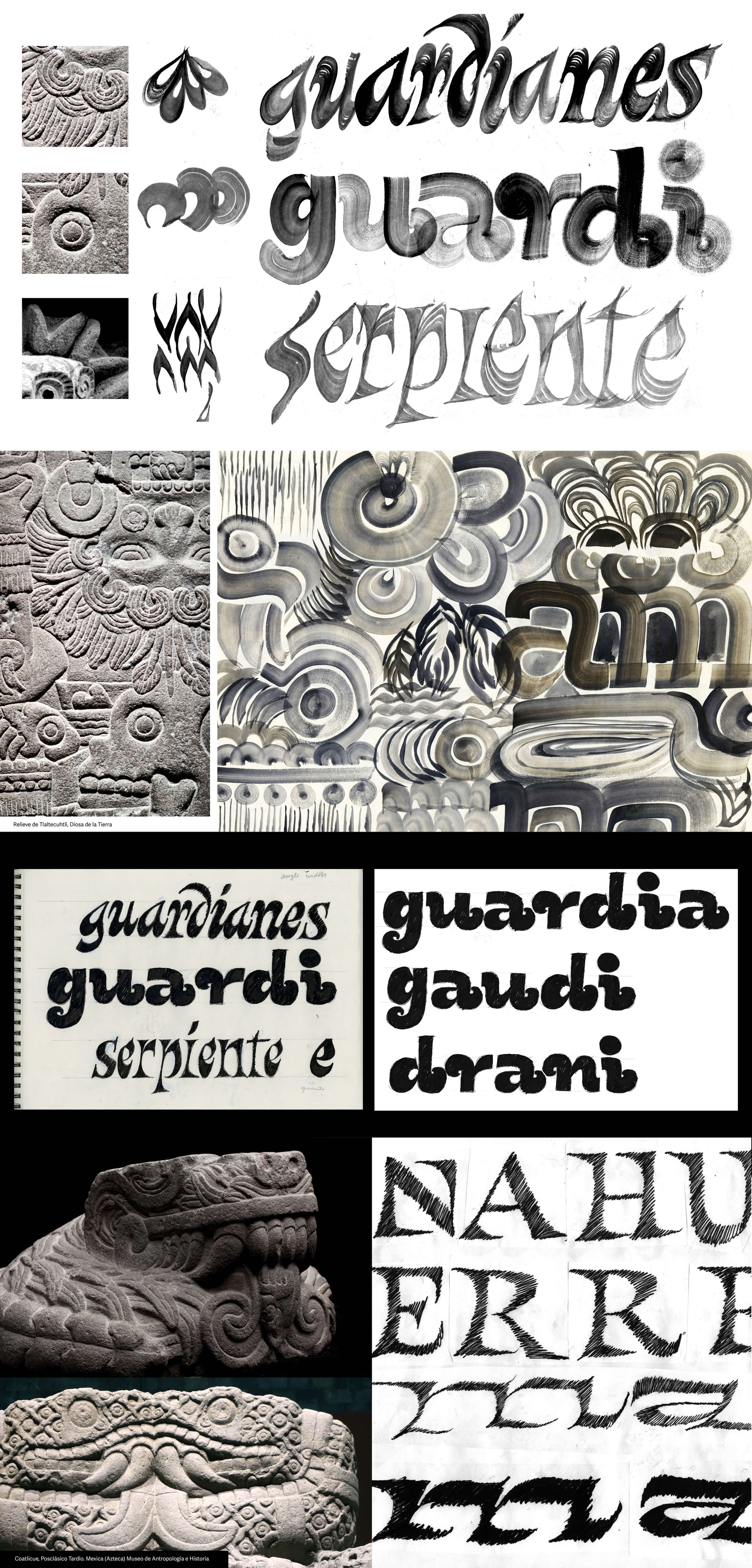 combined with personal brush calligraphy explorations inspired by modern interpretations of pre-Hispanic carvings found in Mexico.