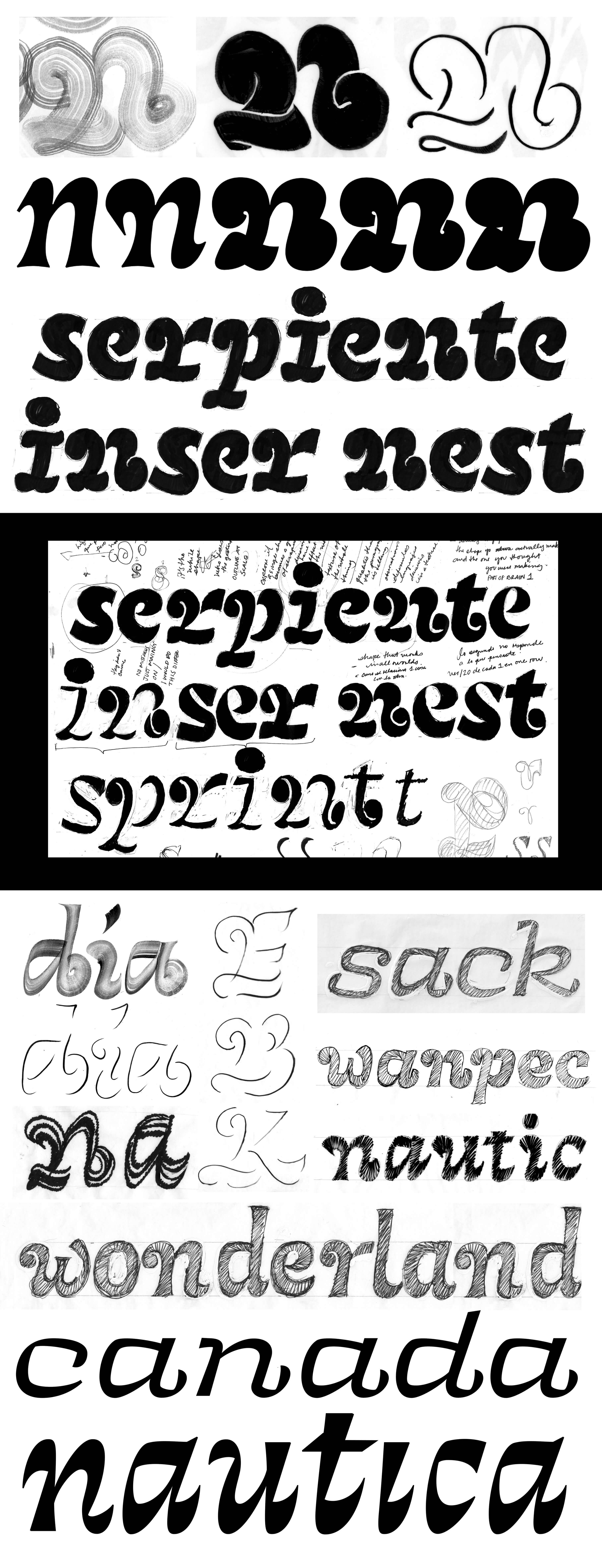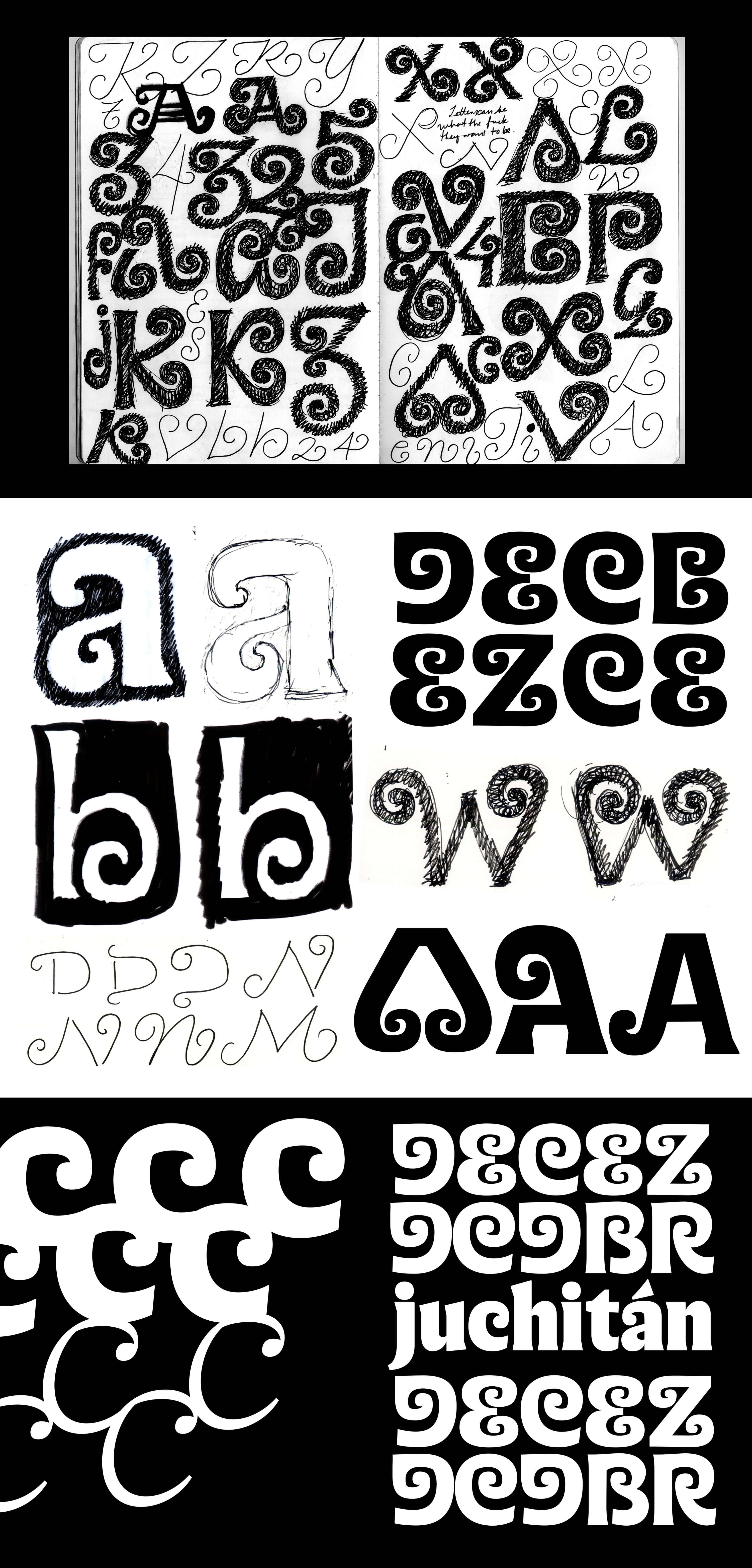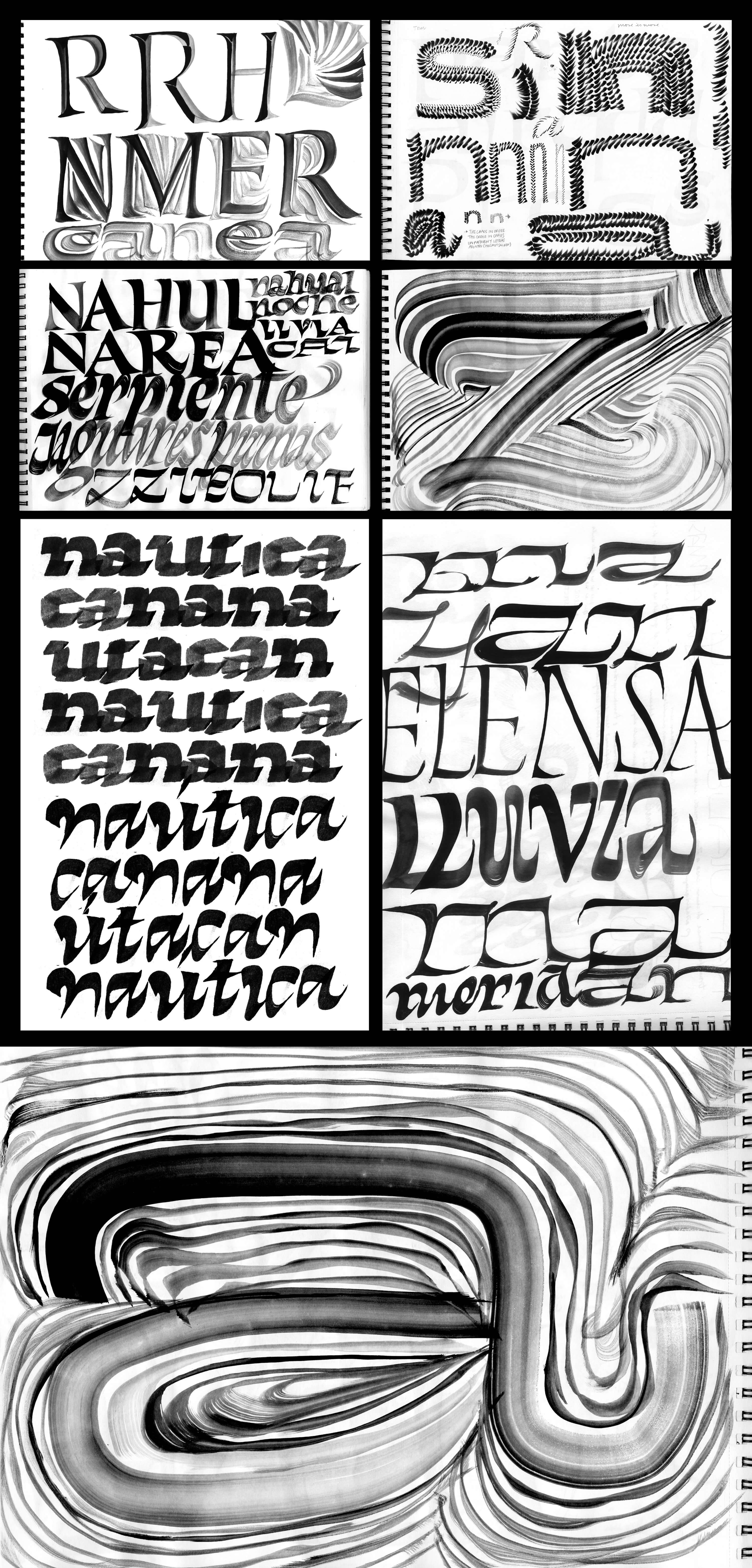 combined with personal brush calligraphy explorations inspired by modern interpretations of pre-Hispanic carvings found in Mexico.