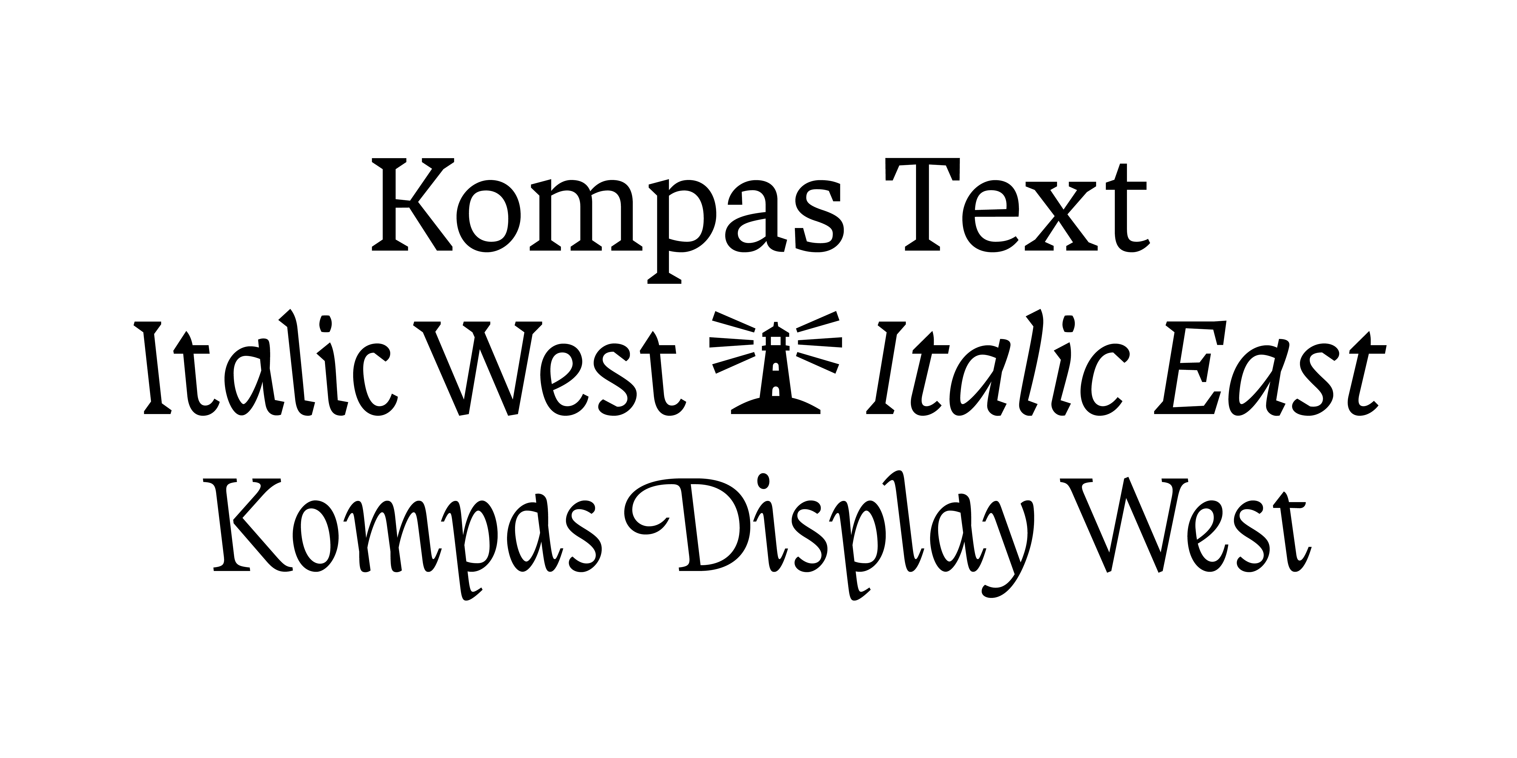 Kompas is the exploration of an unusual concept; a text type family that includes two equal bidirectional cursives. It breaks with the habit of right-leaning italics as the main cursive style, advertising to not only look right but also left. It comes in four carefully crafted styles, including a text roman and two complementary text italic styles, leaning both left and right. As a versatile companion when setting sails for long reading texts in book, magazine, web application and poster design, it provides an elegant display italic style for titling and logo type. Never following just one way and going both directions, Kompas is meant to gently guide the curious reader. Left or right? Yes!