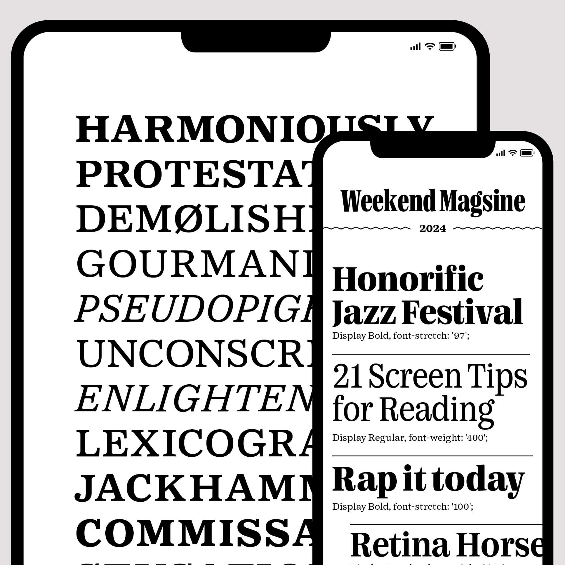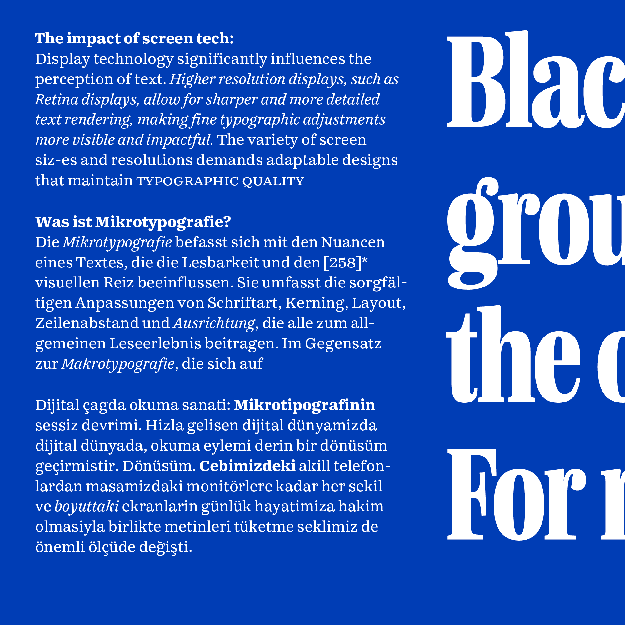 Once the project’s direction was set—and the text styles were nearing finalization—attention returned to the display styles first explored at the outset. These were systematically refined to align with the underlying typographic logic of the family, ensuring a consistent tone of voice while providing typographers with flexible tools for setting titles. To expand their usability, the three display styles were developed as variable fonts along the axes of width and weight, allowing a wide range of expressive possibilities without sacrificing cohesion across the family.