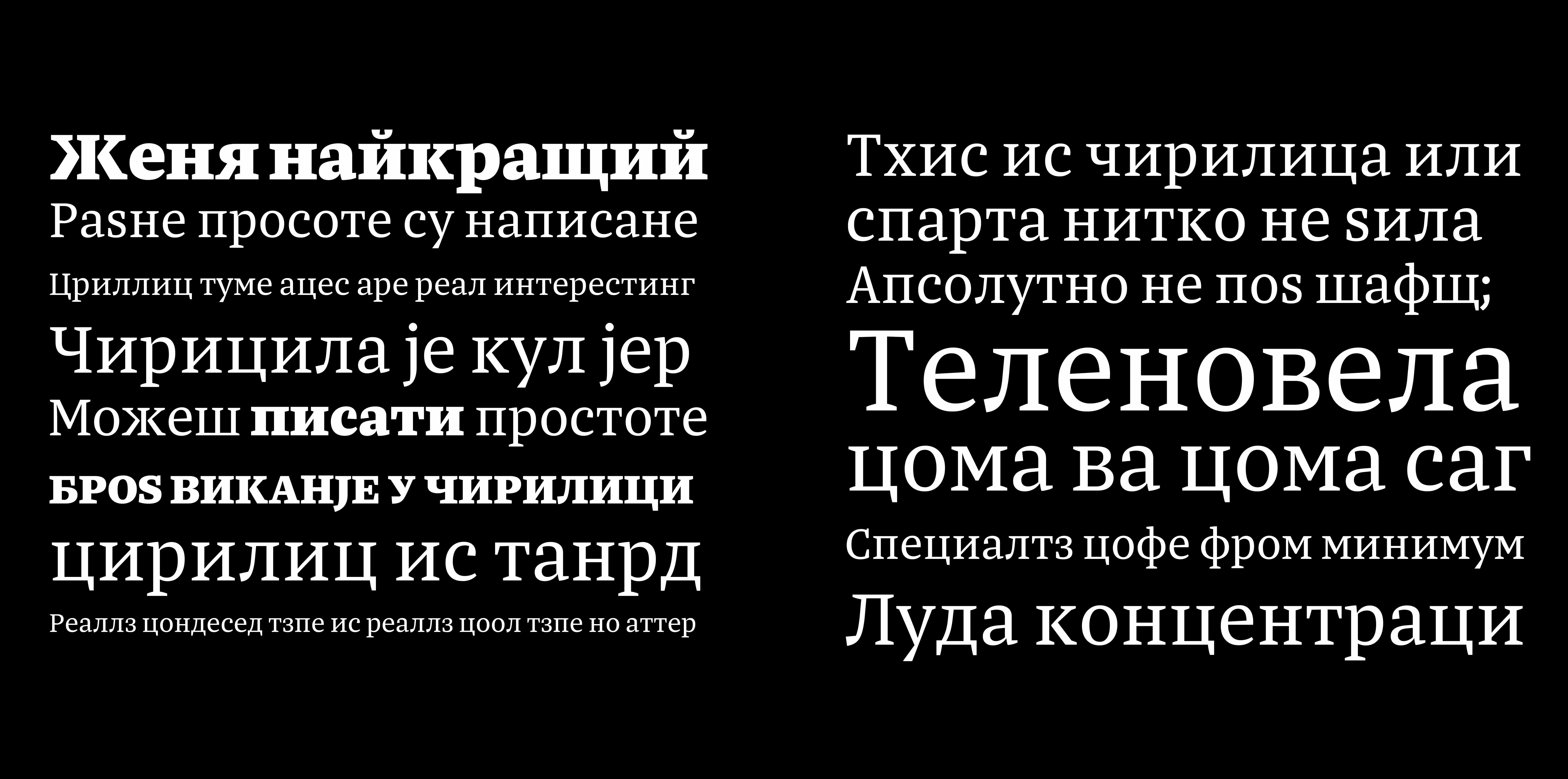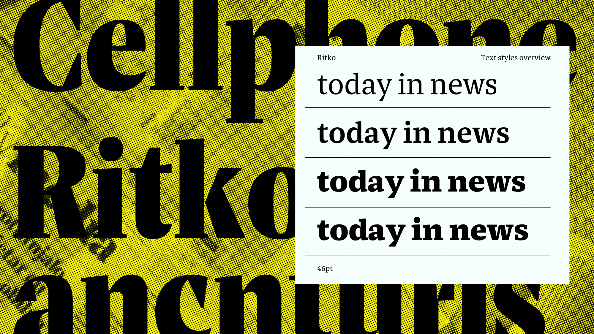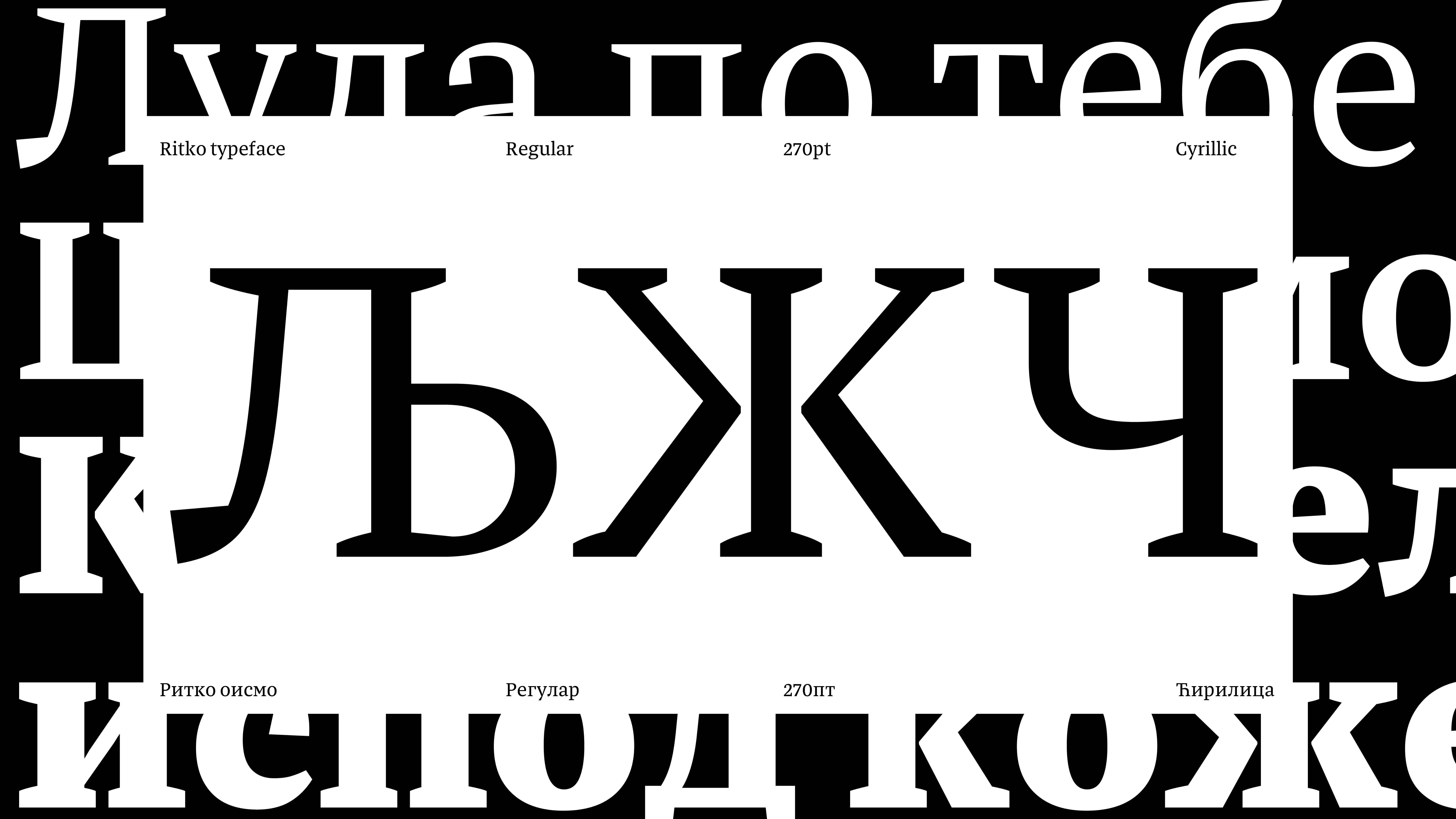 Ritko is a newspaper type family designed to meet all the needs of modern newspaper typesetting. It supports both Latin and Cyrillic scripts, offering text and headline styles in multiple weights, along with accompanying italic text style.