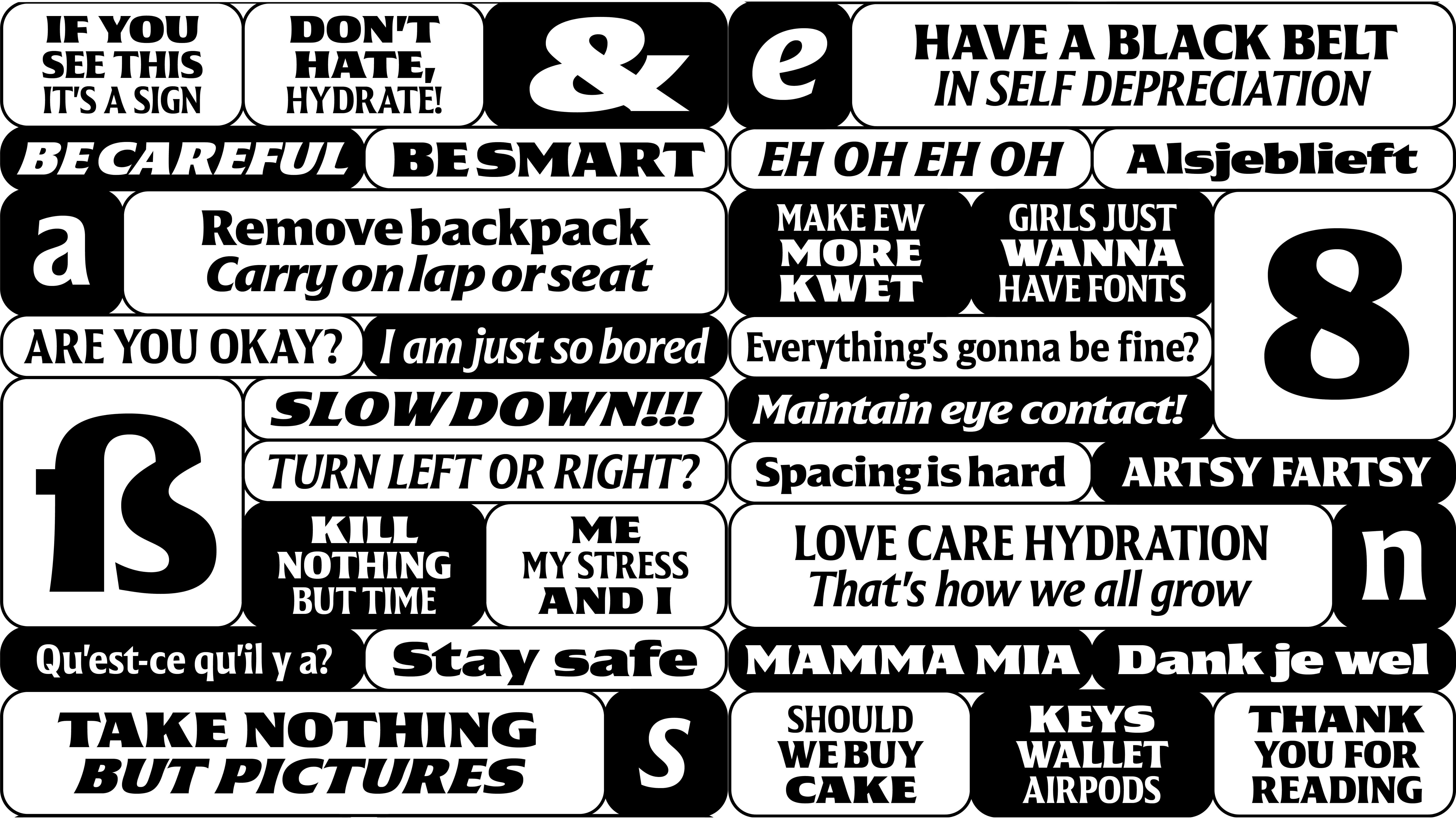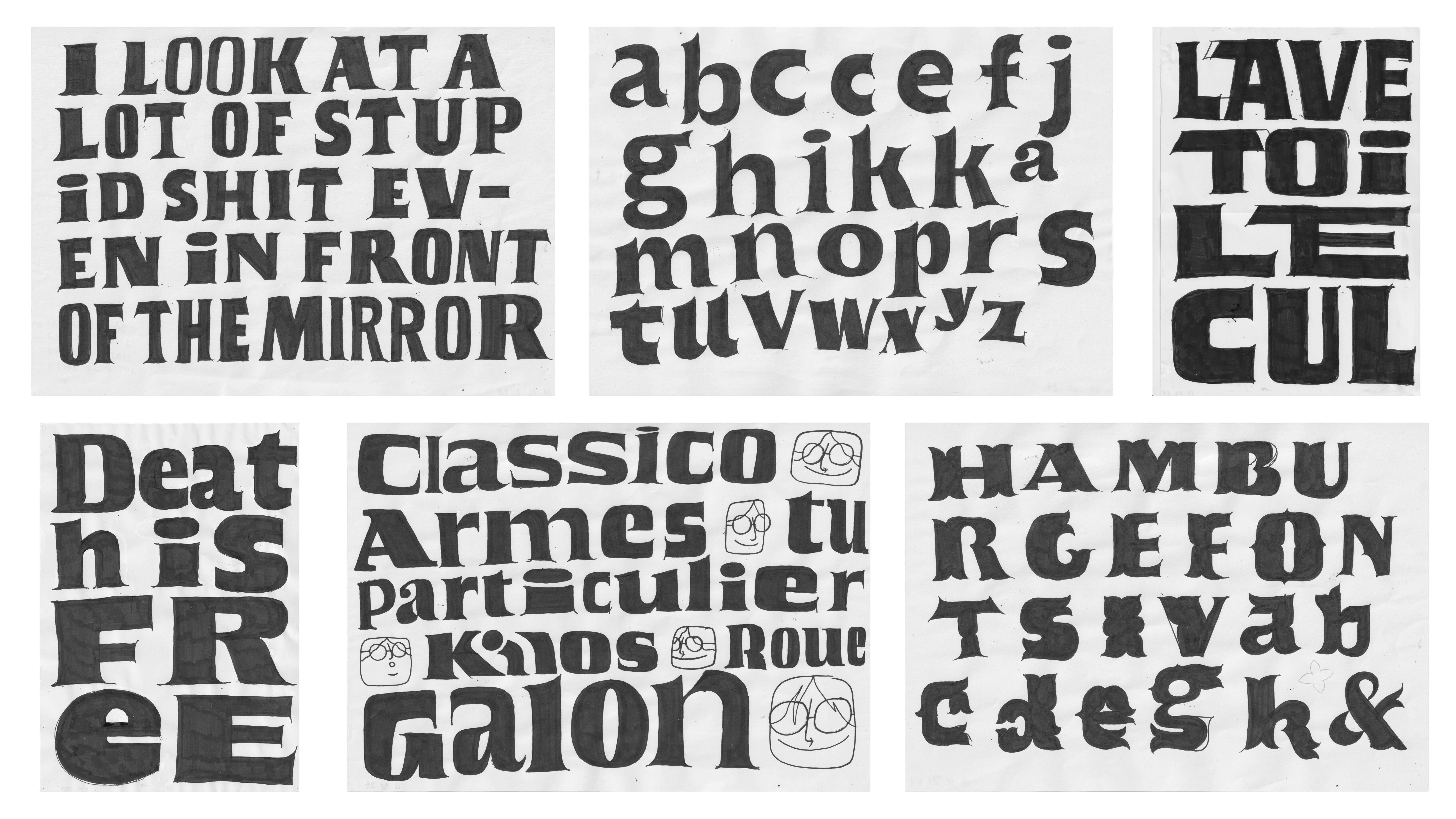 23/02/2024 to 13/03/2024. Spontaneous sketches inspired by friends and family punchlines. Apparently, wanting to design something that plays with brush calligraphy details, weight and widths in relation with the format.