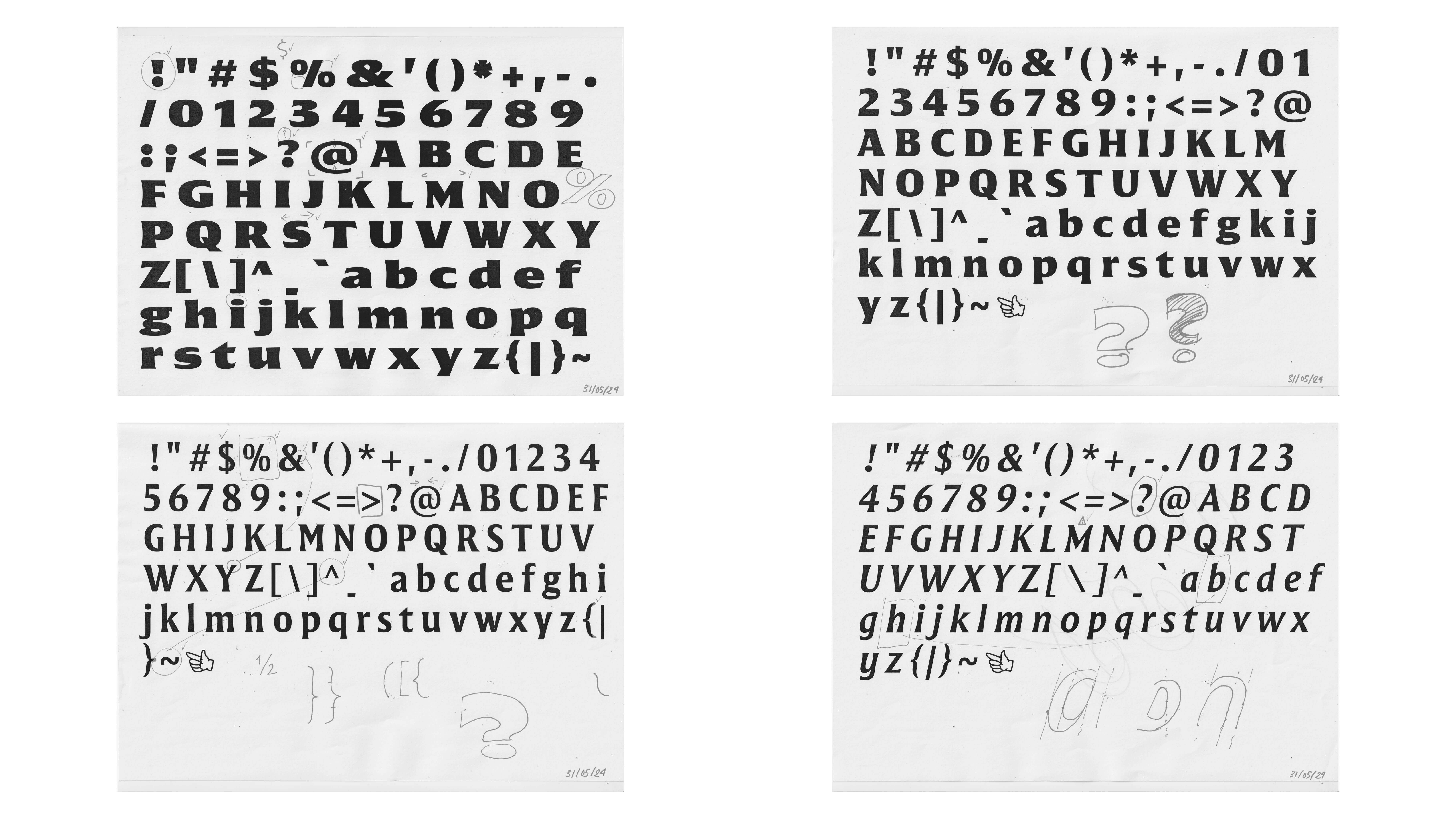 11/04/2024. Exploration and test of printed signs in the studio. Deciding to focus on one master at a time, to allow myself to slowly define the design, and keep learning and improve my questionable skills.