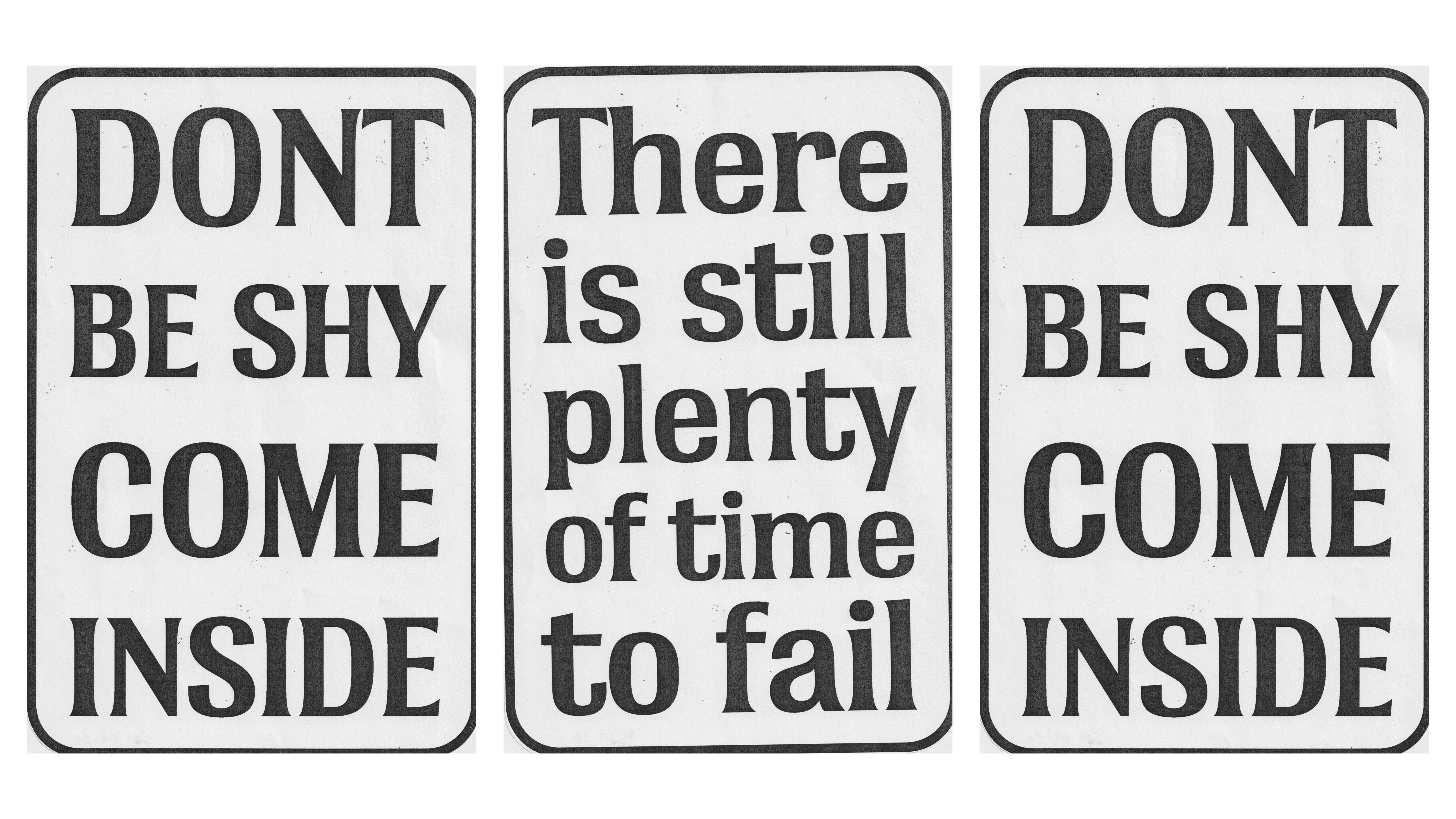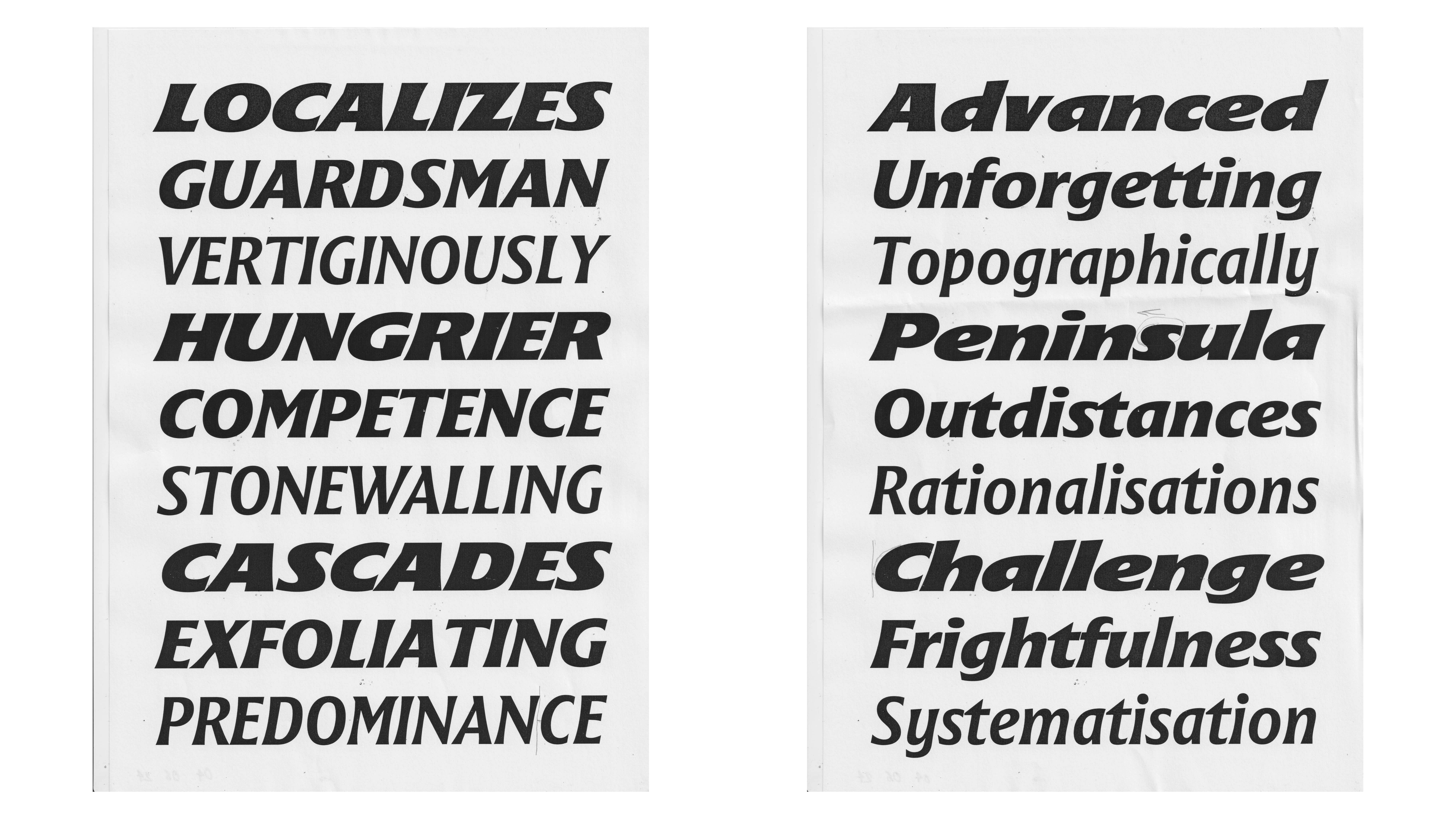 18/04/2024. More exploration and testing of printed signs in the studio. Lowering the contrast and taming down the spiky terminals to improve legibility at a certain distance.
