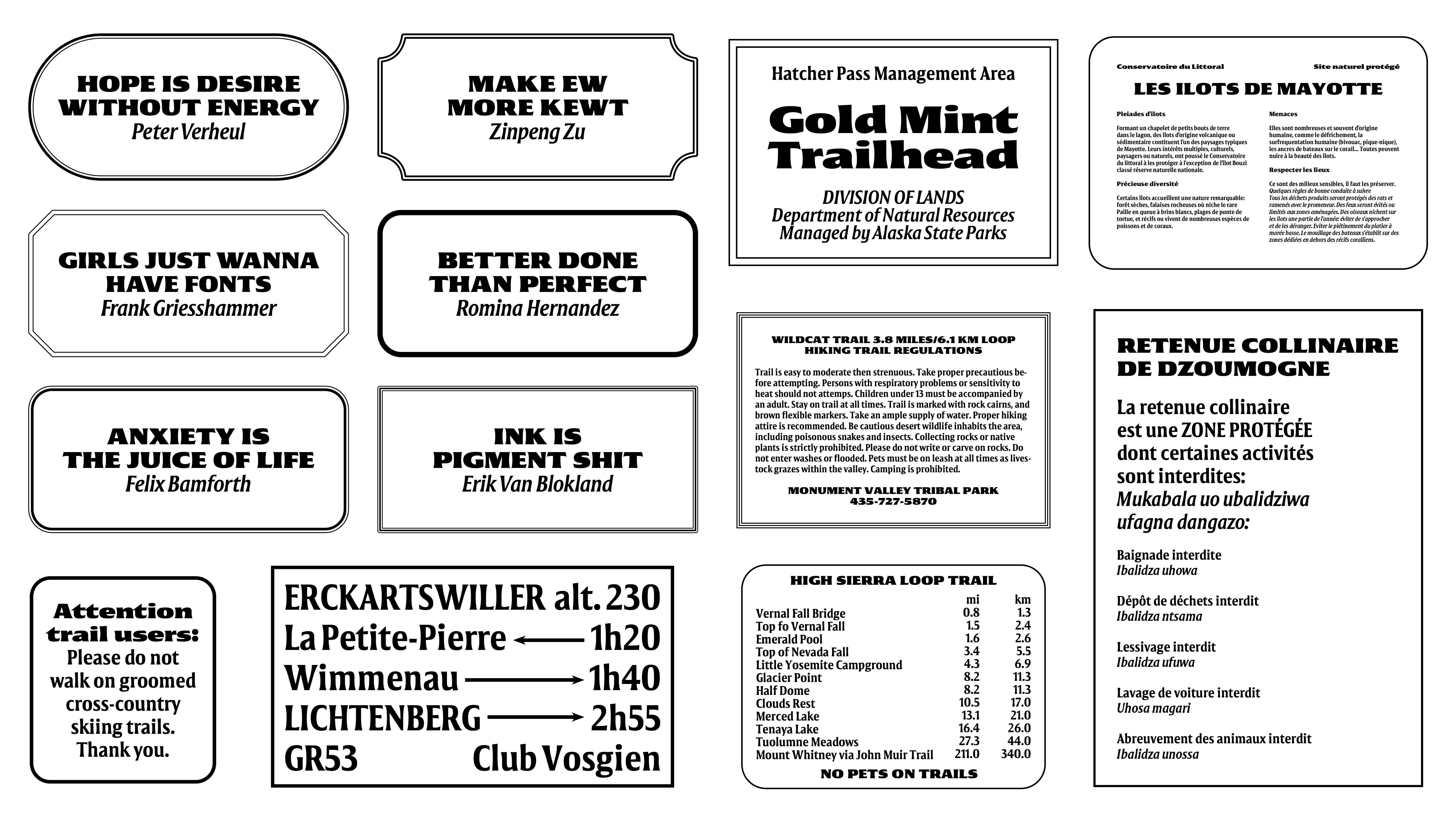 14/05/2024. Feedback from Céline Hurka. Gathering archive material of hiking signs to better understand the constraints and the needs, and proof the typeface. Since the beginning of the second semester, the project file was named « Da-project », that day it felt natural to name the typeface « Disway ».